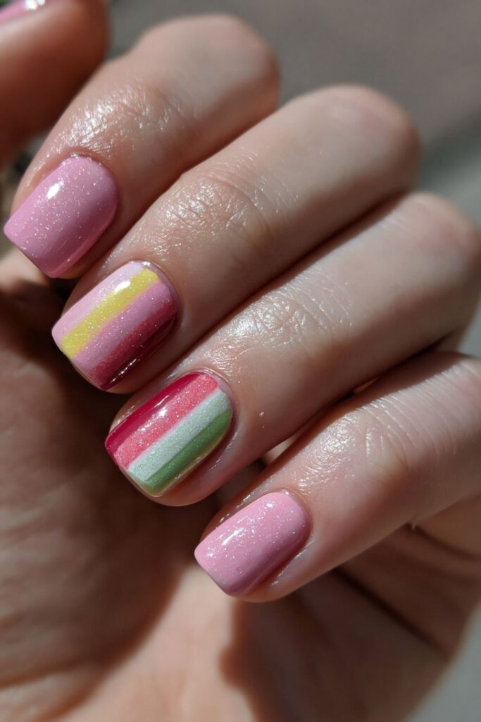 Bright mismatched stripes in pink, yellow, green, and cherry red. Bold, colorful, and unapologetically playful. The vibe is early 2000s meets 2026 jelly aesthetic. Fire for vacation sets or festival season.