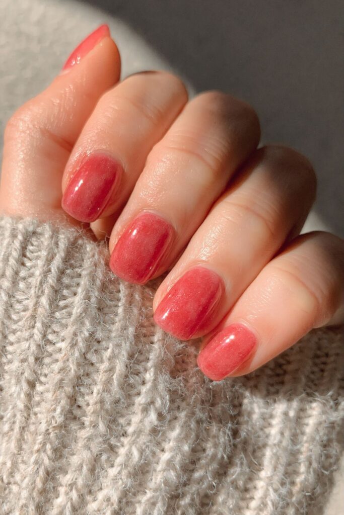 Short square acrylic nails in translucent watermelon red with a glossy jelly finish.