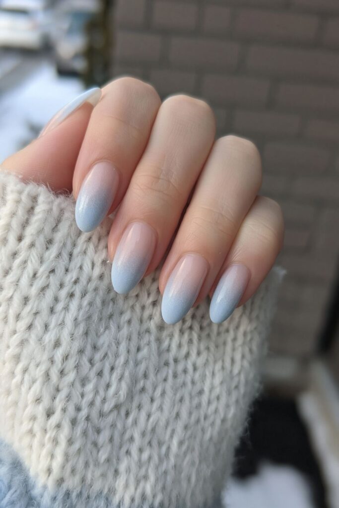 Short almond acrylic nails in soft baby blue with an airbrushed gradient fading to clear edges.