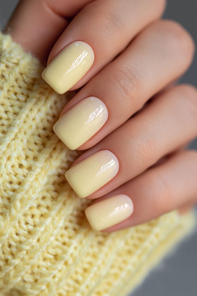 Short square acrylic nails in soft butter yellow with a high-shine glossy finish.