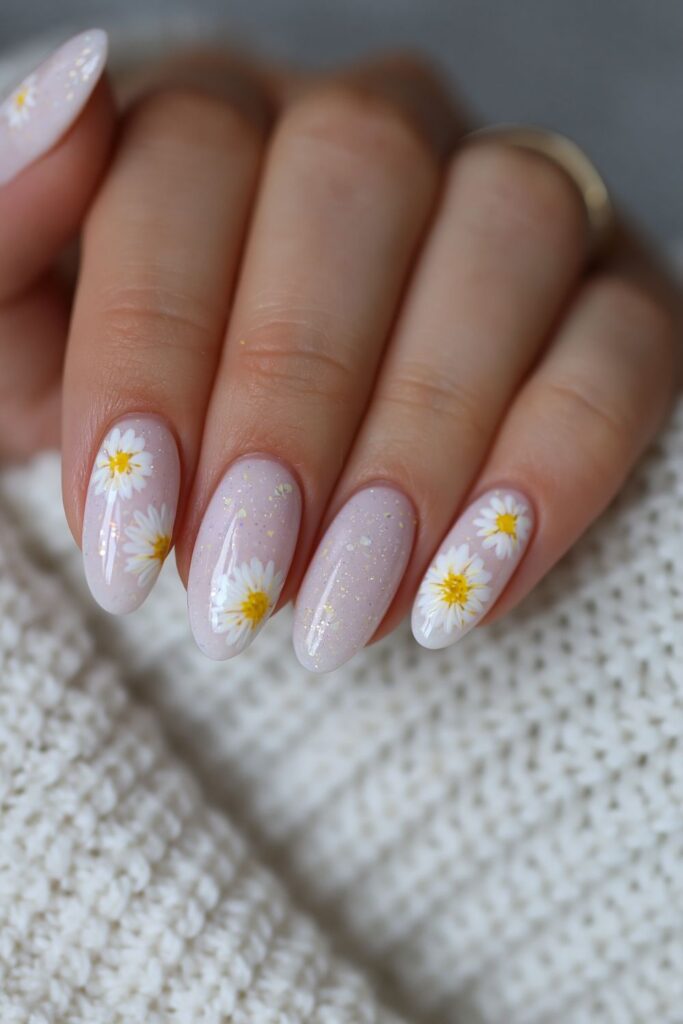 Short almond acrylic nails in milky white with small yellow and white daisy designs on accent nails.