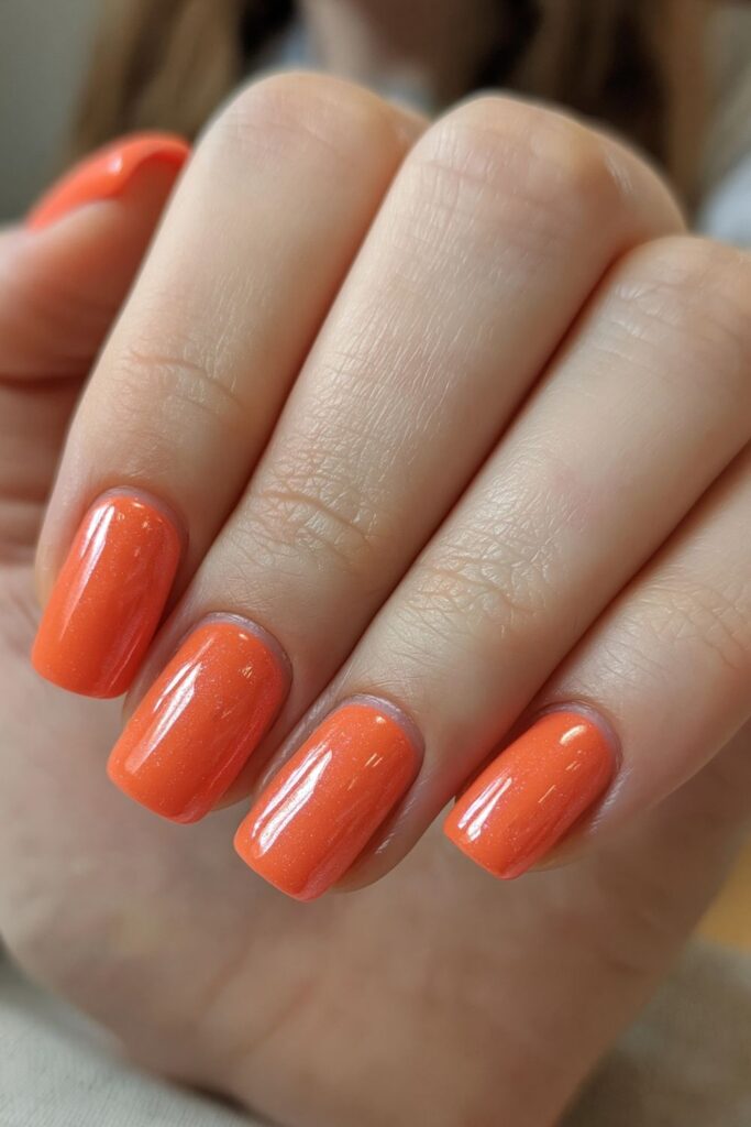Short square acrylic nails in bright tangerine orange with a glazed chrome finish.