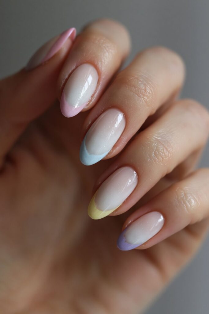 Short almond acrylic nails in milky white with mismatched pastel French tips in pink, blue, yellow, and lavender.