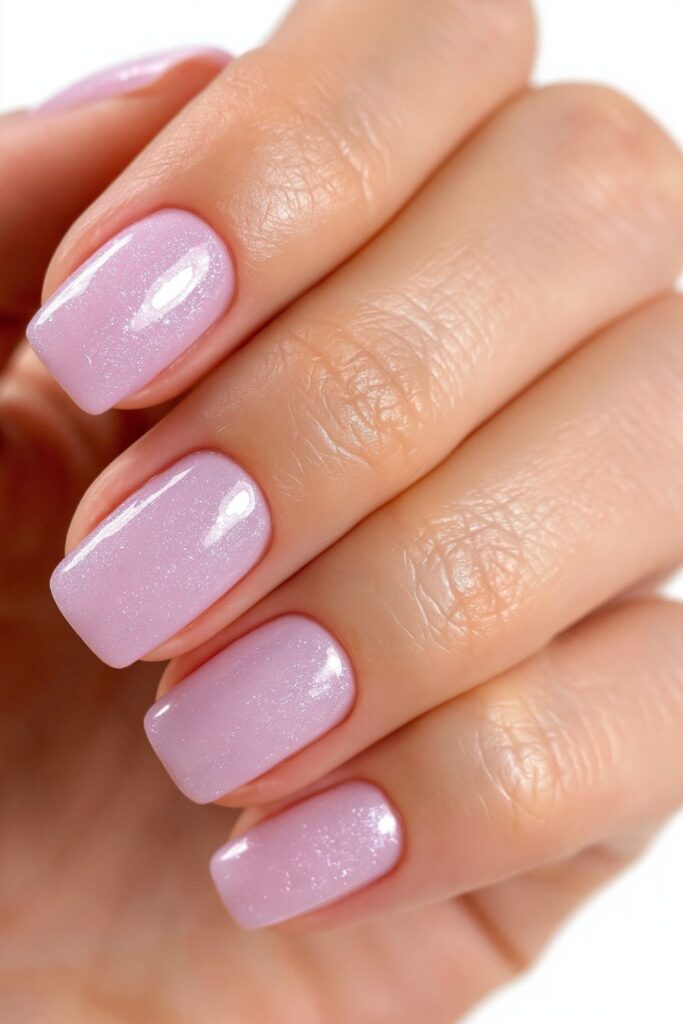 Short square acrylic nails in translucent lilac with a glossy jelly finish.