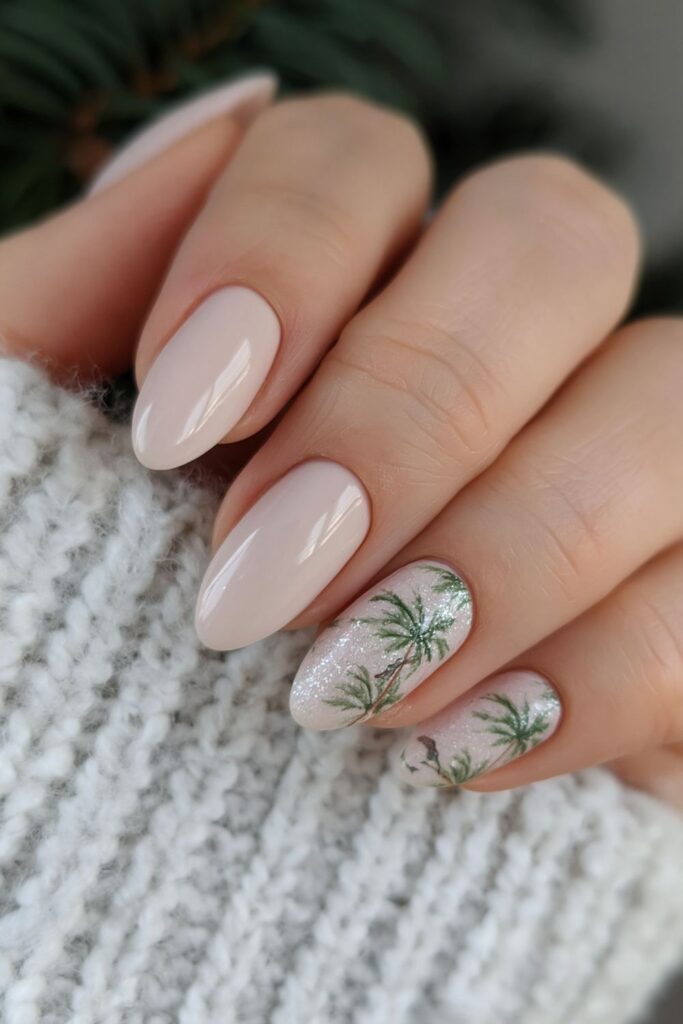 Short almond acrylic nails in soft beige with small green palm tree designs on accent nails.