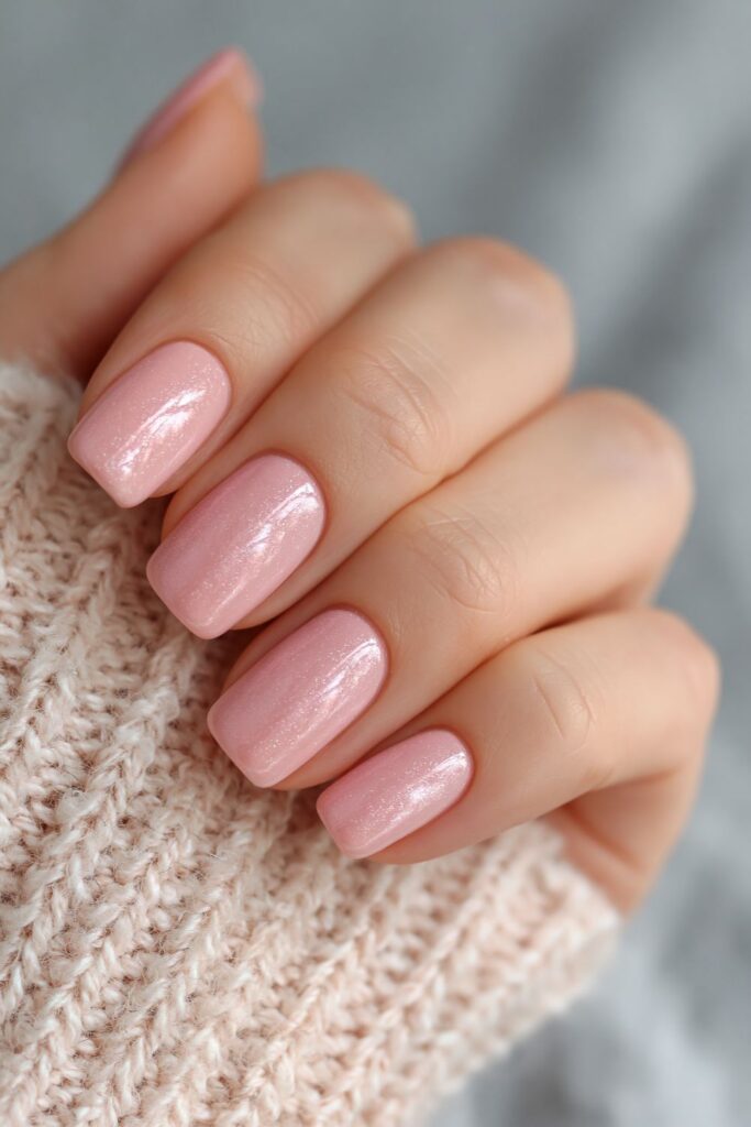 Short square acrylic nails in soft coral pink with a pearl chrome glazed finish.