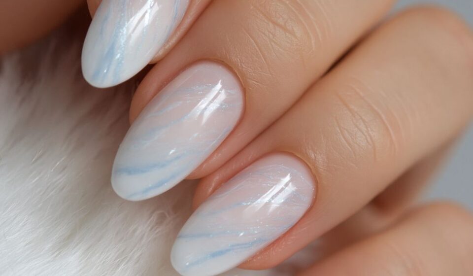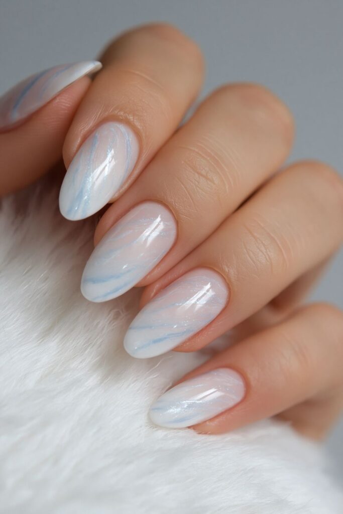 Short almond acrylic nails in milky white with soft blue wave swirl patterns across each nail.