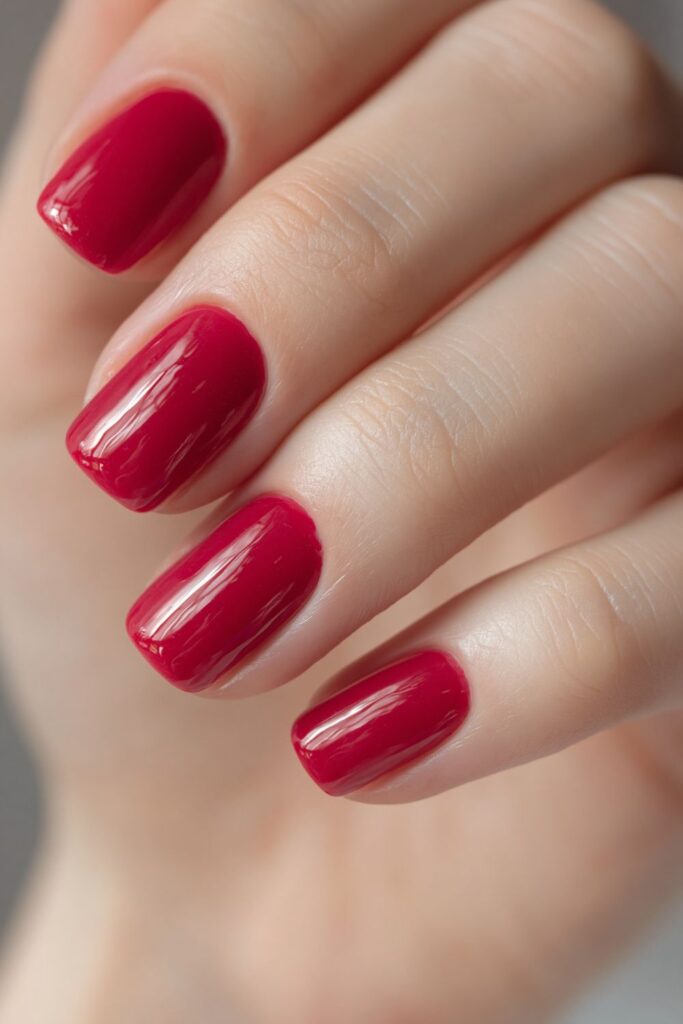 Short square acrylic nails in bright cherry red with a high-shine glossy finish.