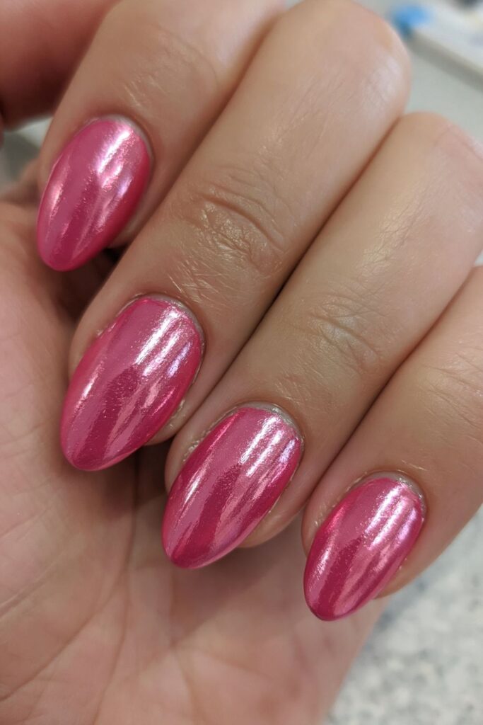 Short almond acrylic nails in bright hot pink with a full mirror chrome finish.