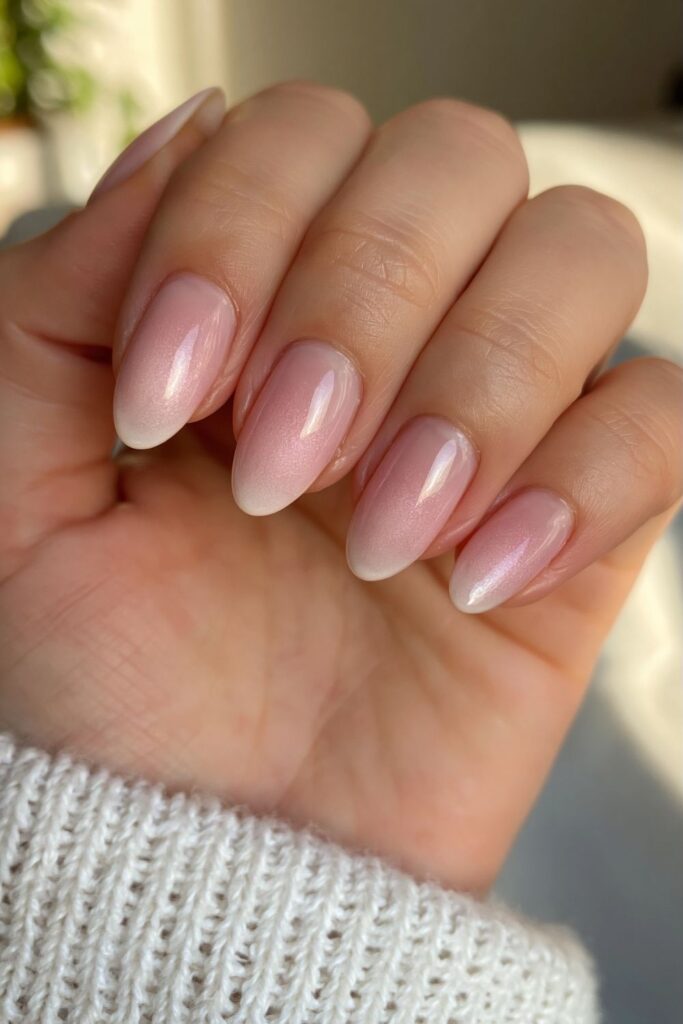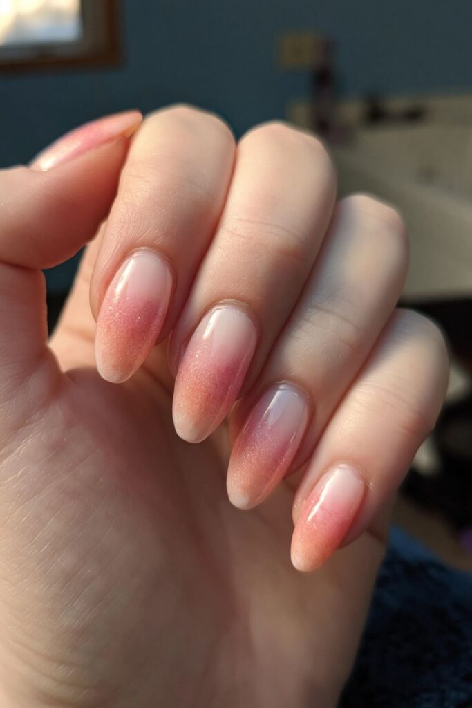 Short almond acrylic nails in sheer pink with a soft pink aura airbrushed at the center of each nail.