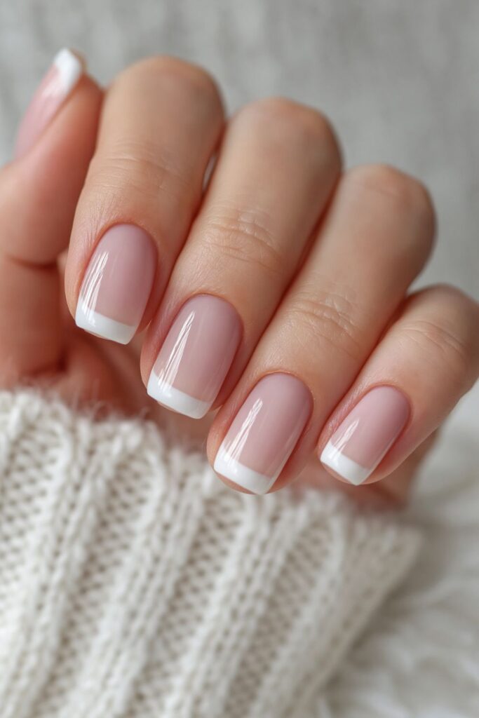 Short square acrylic nails in sheer beige with classic milky white French tips.