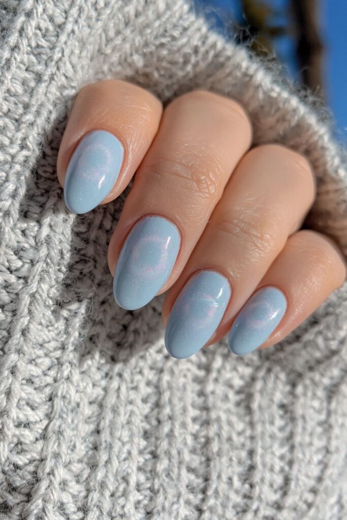 Short almond acrylic nails in soft ocean blue with an airbrushed aura at the center of each nail.