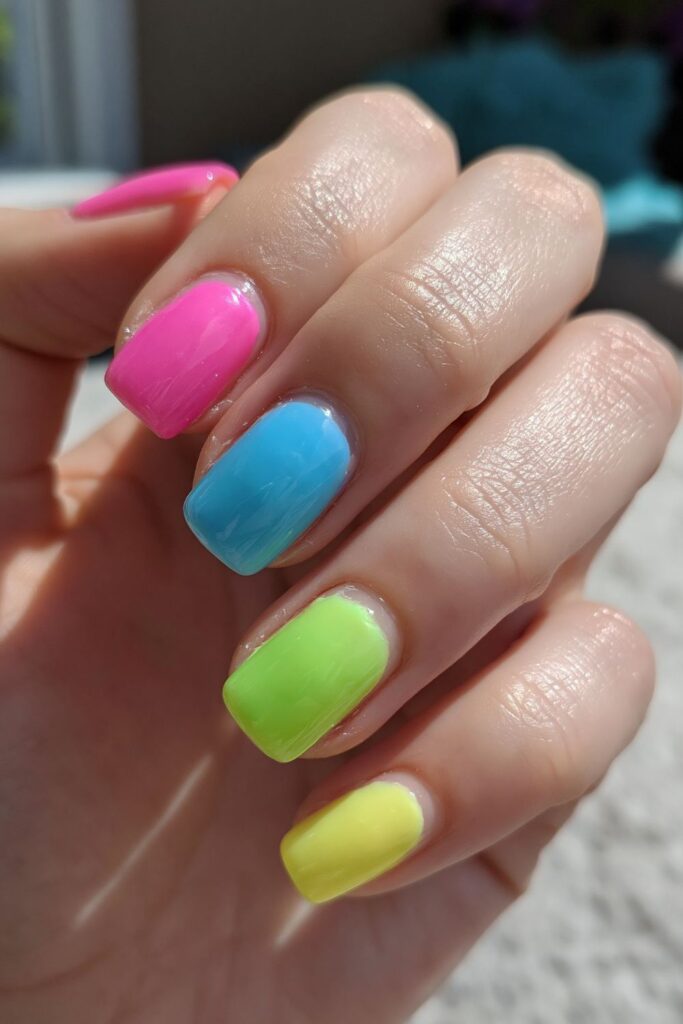 Short square acrylic nails in mixed neon shades: hot pink, lime green, electric blue, and bright yellow.