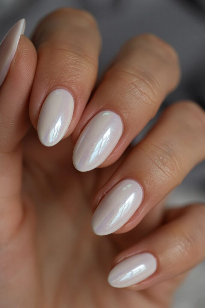 Short almond acrylic nails in milky white with a pearl chrome glazed finish.