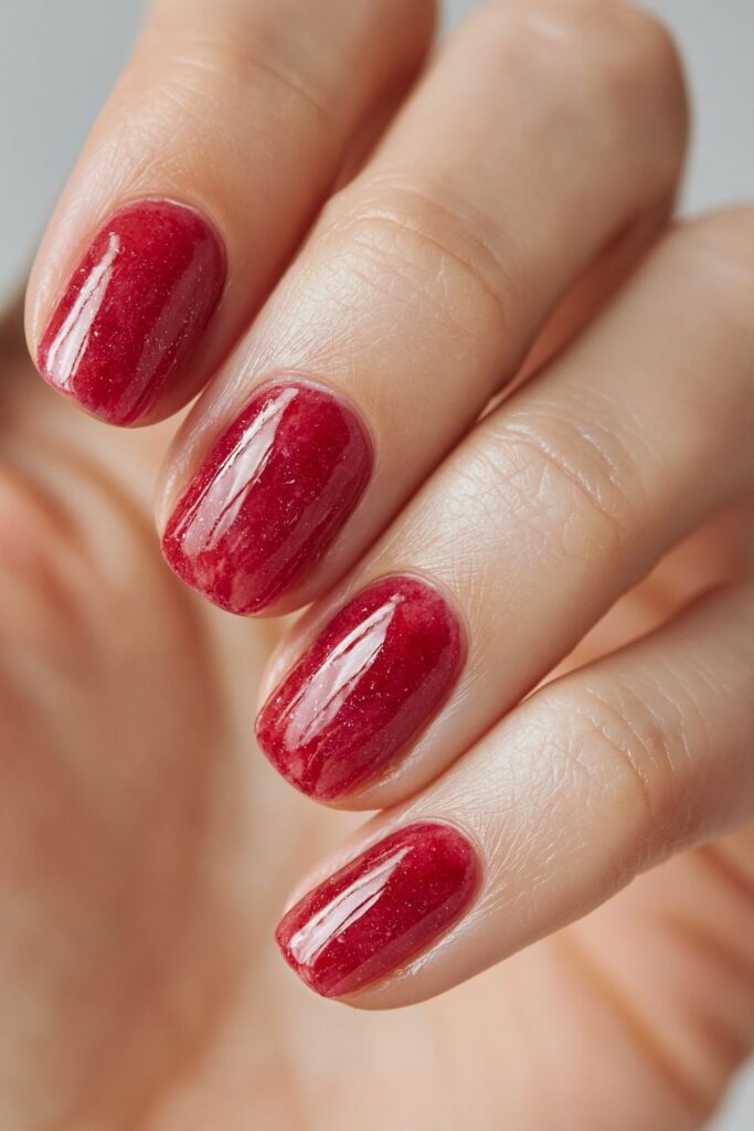 Short square acrylic nails in translucent cherry red with a glossy jelly finish.
