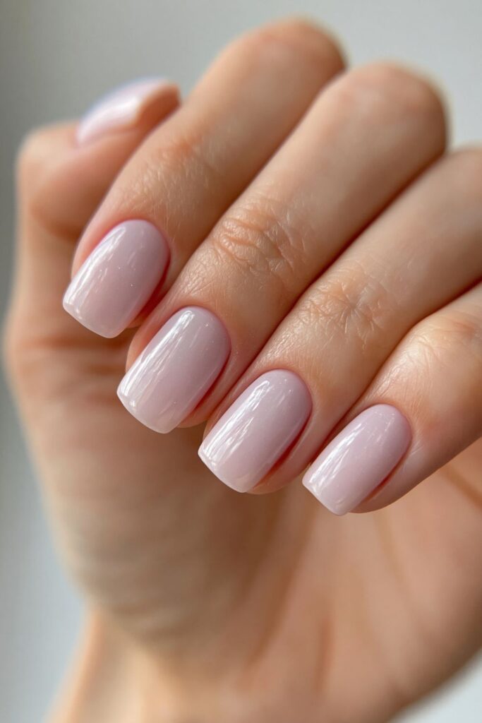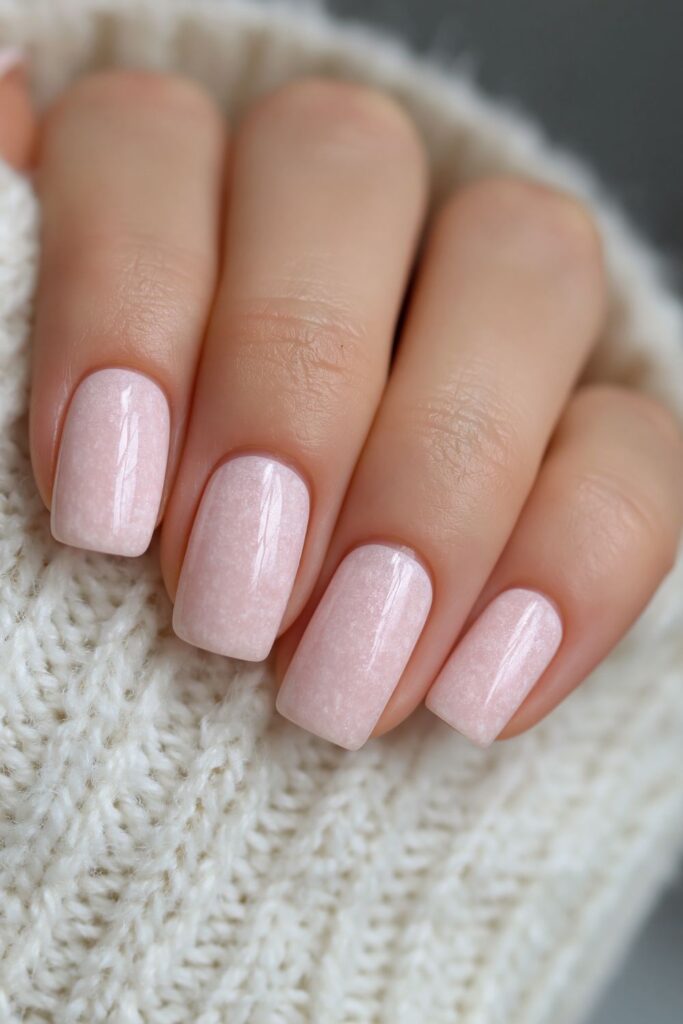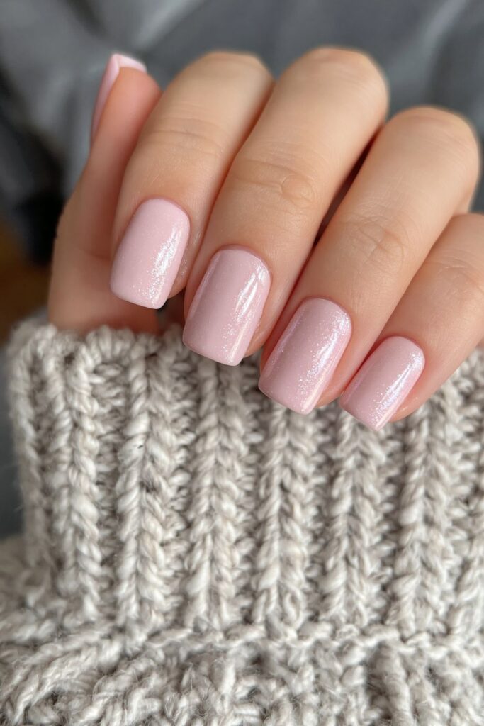 Short square acrylic nails in soft pastel pink with a pearl chrome glazed finish.
