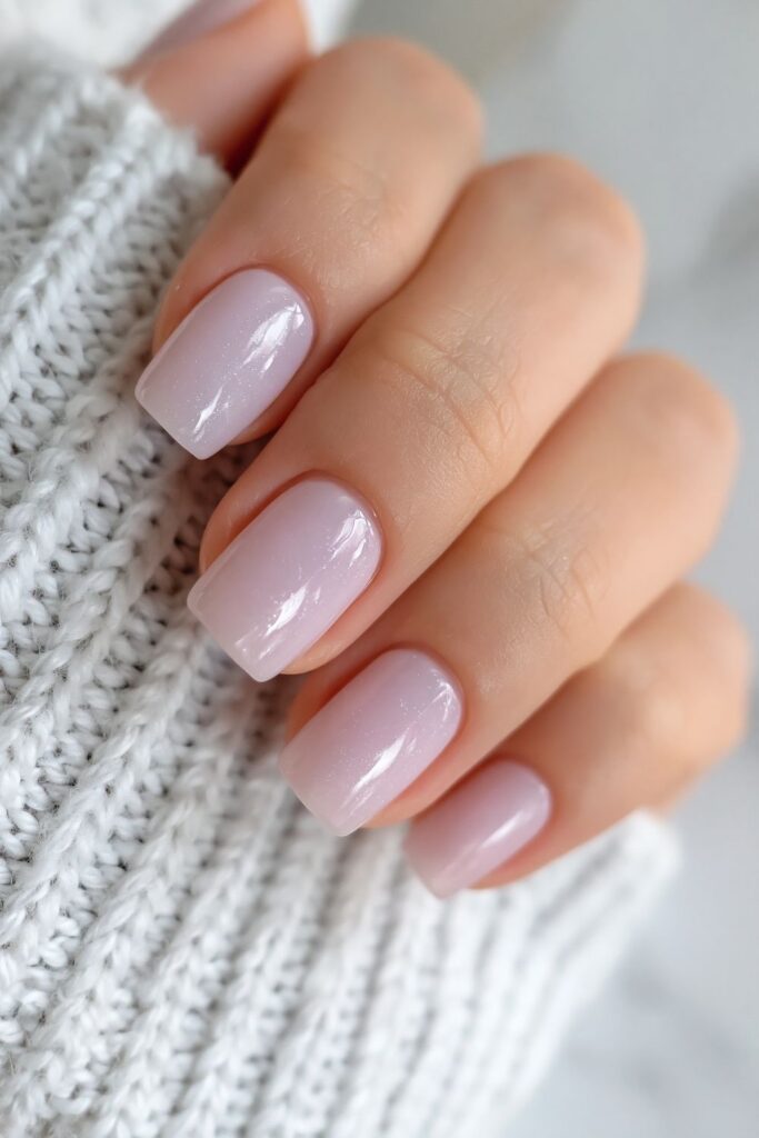Short square acrylic nails in sheer lilac with a glossy glass finish.