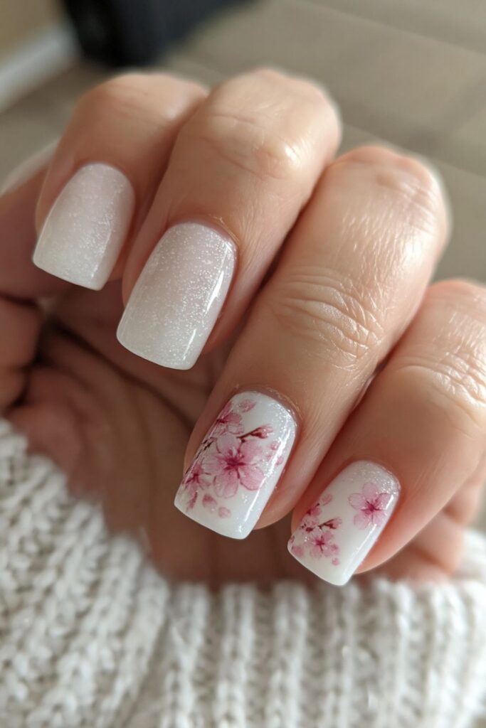 Short square acrylic nails in milky white with small pink cherry blossom designs on accent nails.
