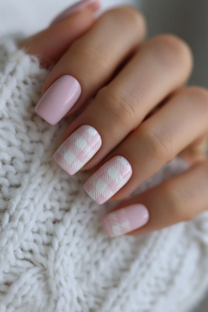 Short square acrylic nails in pink and white pastel checkered pattern across each nail.