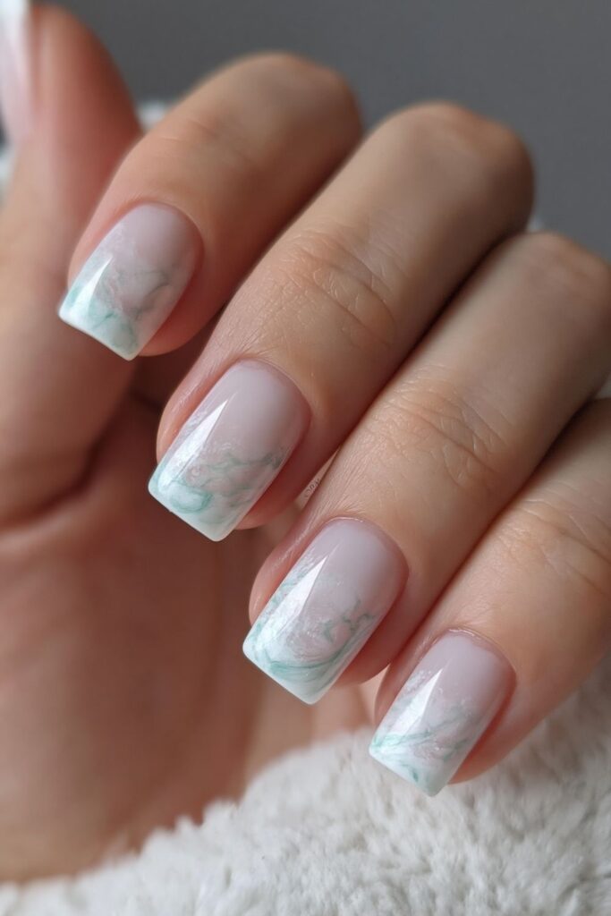 Short square acrylic nails in milky white with soft mint green marble swirl patterns.