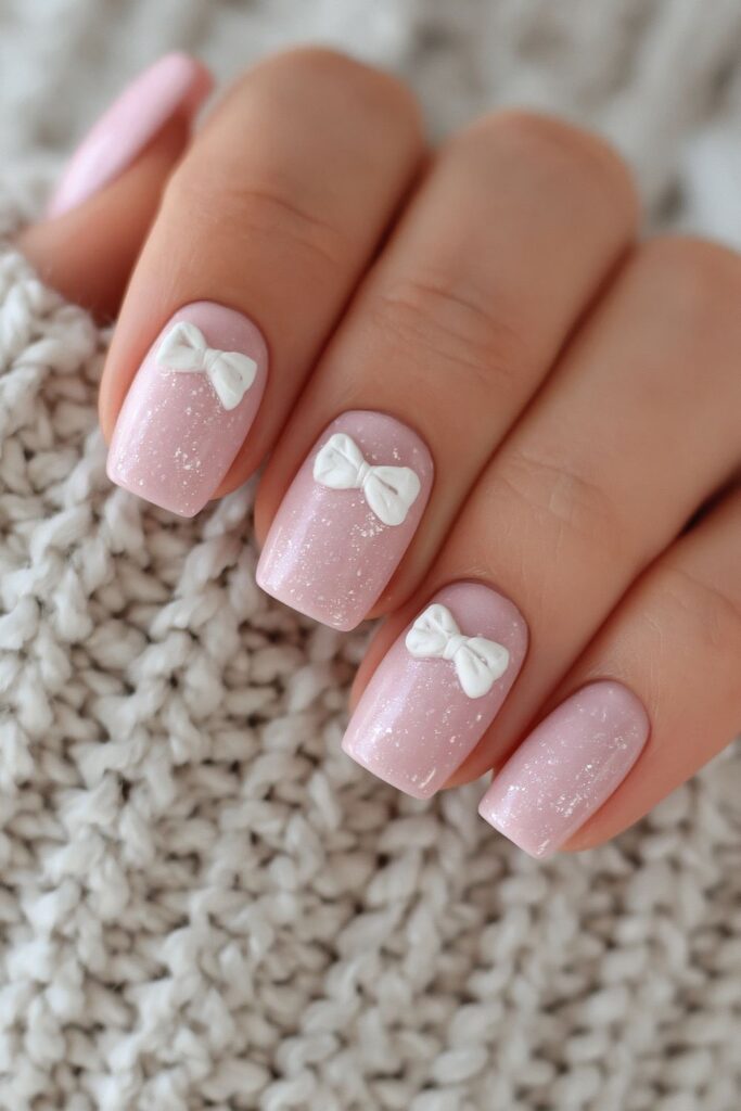 Short square acrylic nails in soft pink with small 3D sculpted white bows on each nail.