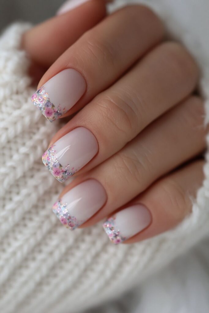 Short square acrylic nails in milky white with tiny pastel floral patterns on the French tips.