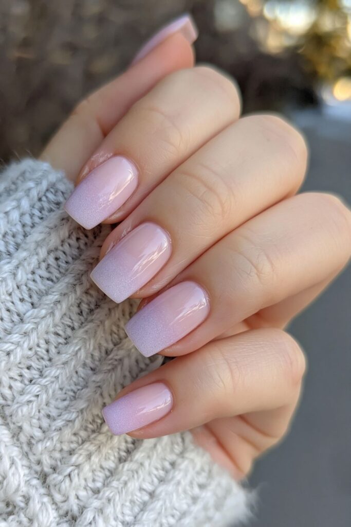 Short square acrylic nails with a soft pink to lavender ombré gradient across each nail.