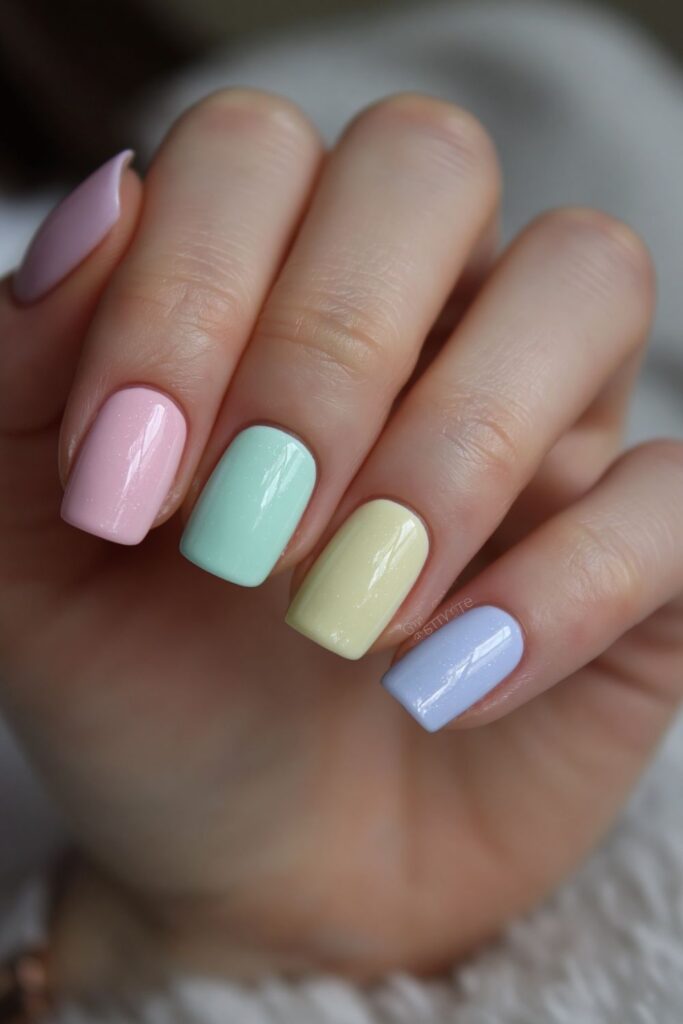 Short square acrylic nails in mismatched pastel shades: pink, mint, lavender, butter yellow, and baby blue.