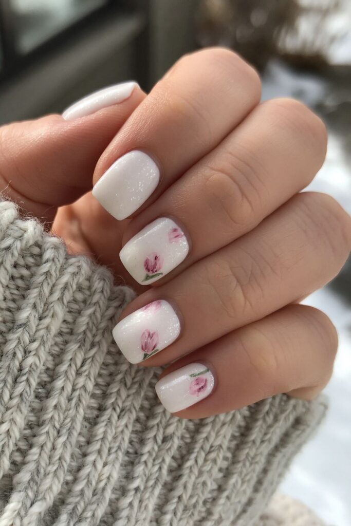 Short square acrylic nails in milky white with small pink tulip designs on accent nails.