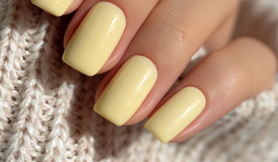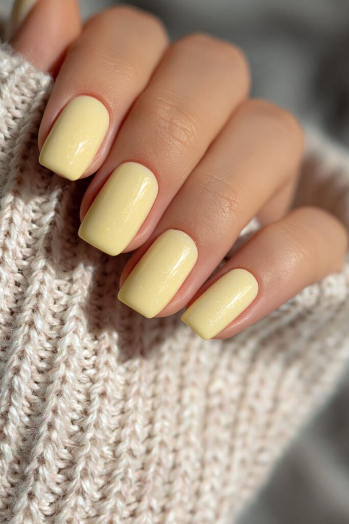 Short square acrylic nails in translucent butter yellow with a glossy jelly finish.