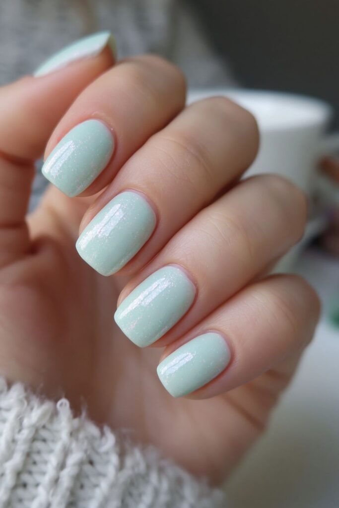 Short square acrylic nails in soft mint green with a glazed chrome finish.