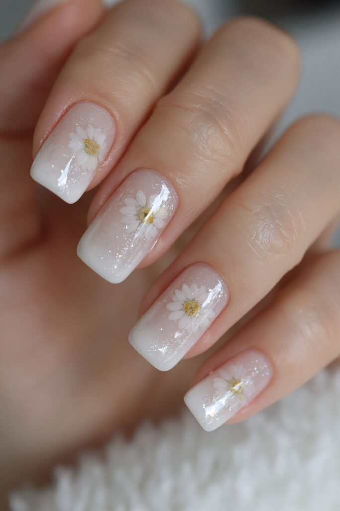 Short square acrylic nails in milky white with small pressed daisies encapsulated under the gel.