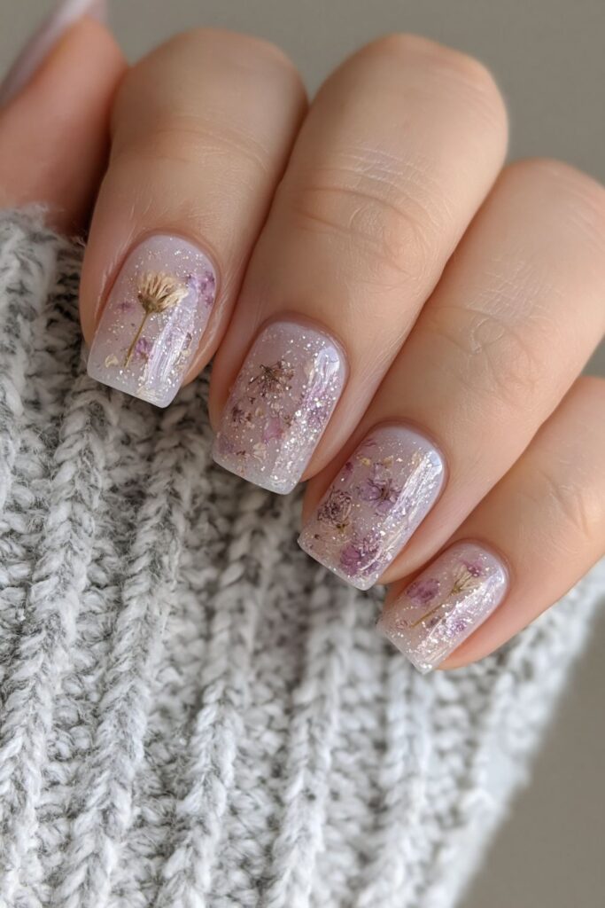 Short square acrylic nails in milky lavender with small dried flowers encapsulated under the gel.