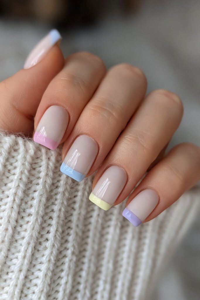 Short square acrylic nails in milky white with mismatched pastel French tips in pink, blue, yellow, and lavender.