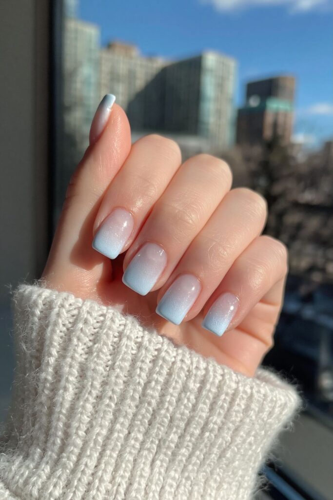 Short square acrylic nails in soft baby blue with an airbrushed gradient fading to clear edges.