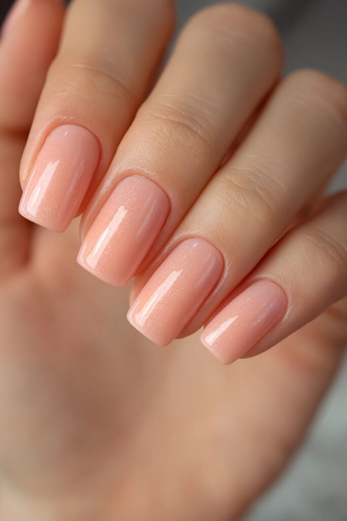 Short square acrylic nails in soft peach with a high-shine glossy finish.