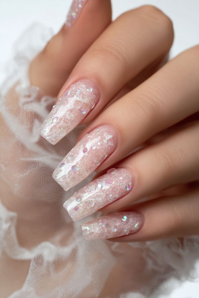 Tiny crushed pearls and iridescent flakes are tucked under a clear layer of acrylic for a deep, 3D effect. The finish looks like the inside of a seashell. It’s a dreamy, ethereal set that feels very mermaid-core and unique for 2026.