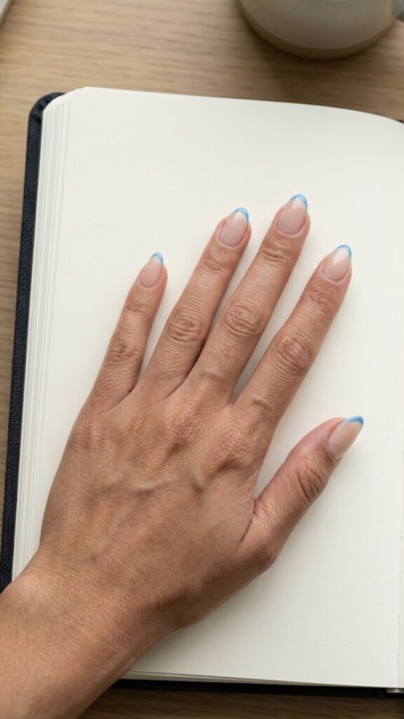 For a super clean and minimal vibe, ask for these tiny blue lines at the very edge of your almond shape. The micro-French technique is perfect for medium length nails because it elongates the finger. Simple, chic, and goes with every single outfit.