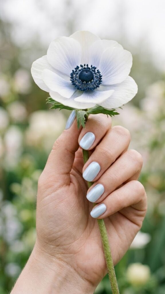Soft and glowing, this set uses a pearl pigment over a very pale blue base. The result is a sophisticated sheen that looks like the inside of a seashell. Perfect for a bridal look or anyone who loves a quiet luxury mani.