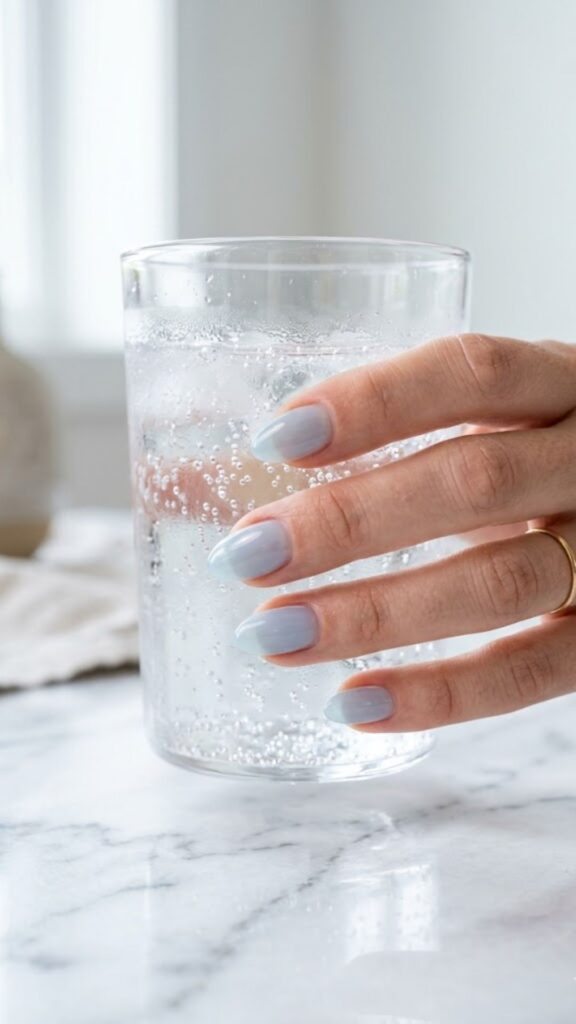 Think glazed donut but in a soft lavender-blue tint for a clean girl aesthetic. A light dusting of iridescent pearl powder over a sheer base creates that viral shimmering glow. Such a classy way to keep your almond set looking fresh and bright.