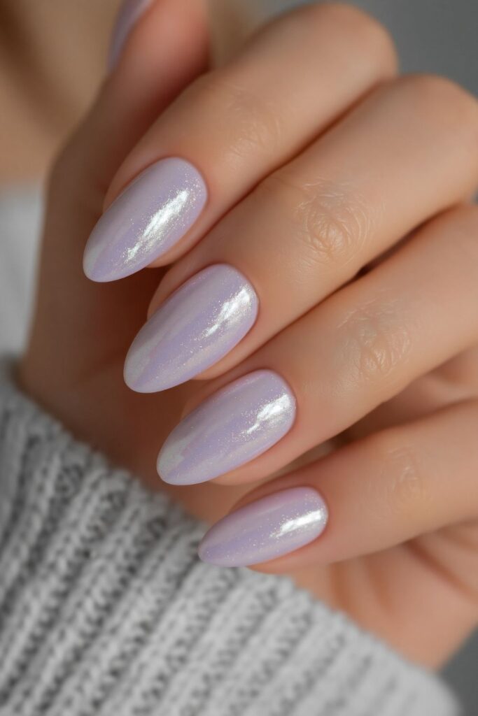 Medium almond acrylic nails in soft lavender with a pearl chrome glazed finish.