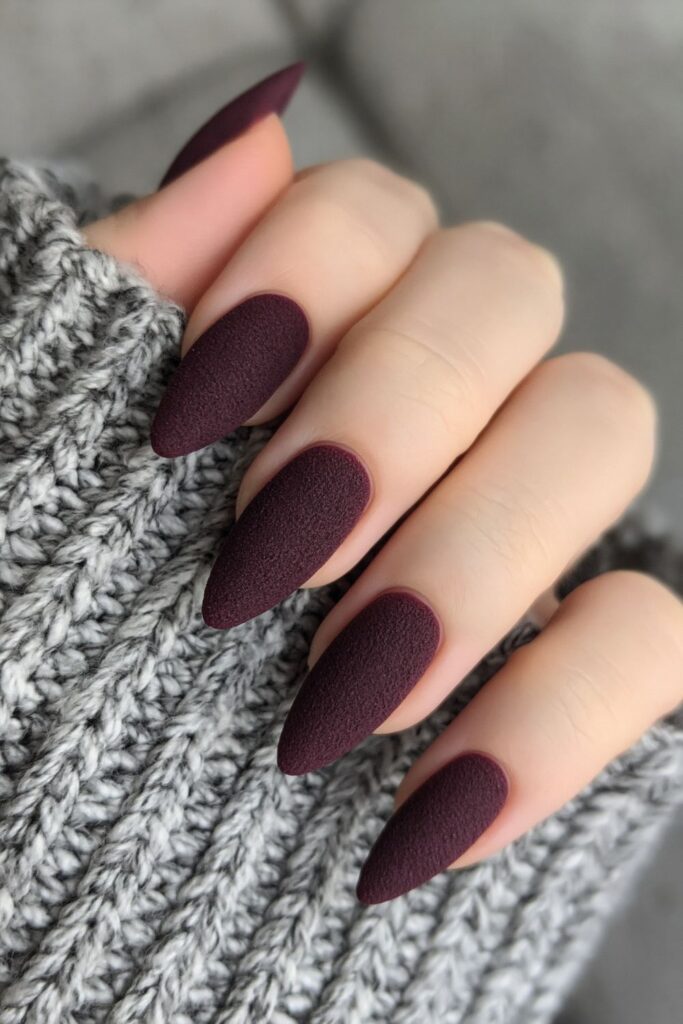 Medium almond acrylic nails in deep burgundy with a velvet matte finish.