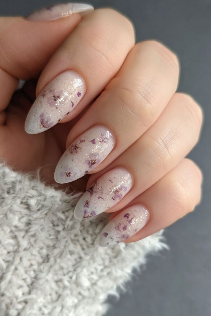 Medium almond acrylic nails in milky white with small dried flowers encapsulated under the gel.