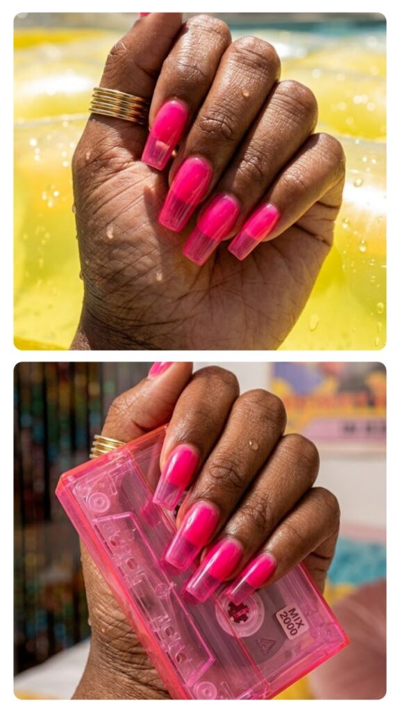 Bright pink jelly polish gives these a translucent, candy-like appearance that’s totally FunHaus. The glass nail trend is back and bolder than ever for the summer season. Pair this with a high-shine top coat for that extra juicy, wet look.