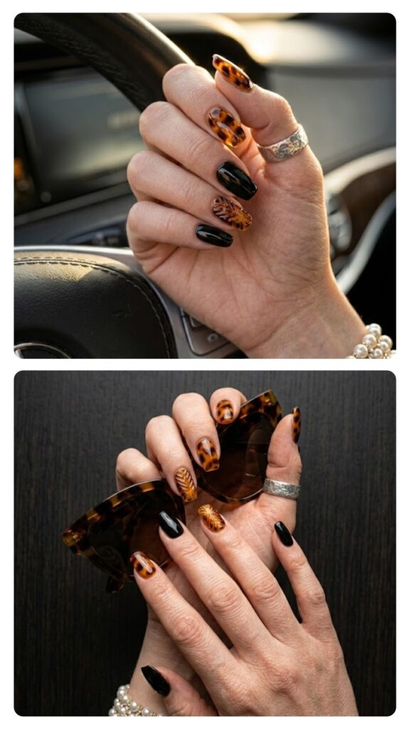 Classic brown and amber tones are layered to create a realistic tortoiseshell pattern on select nails. Mixing this with solid black or tan nails keeps the look balanced and trendy. It’s a timeless print that always looks chic on an acrylic set.