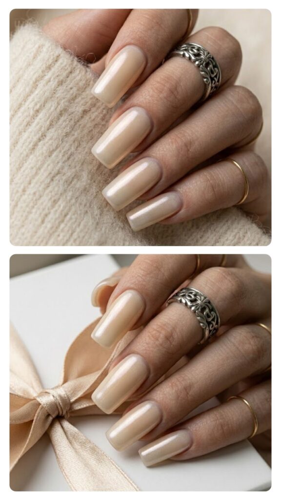 Think glazed donut but with a warmer, creamy base for a quiet luxury feel. The shimmering chrome powder gives these a pearlescent finish that literally goes with everything in your closet. It’s the ultimate fresh set for a minimalist who still wants to shine.