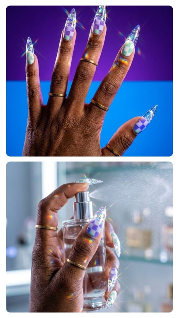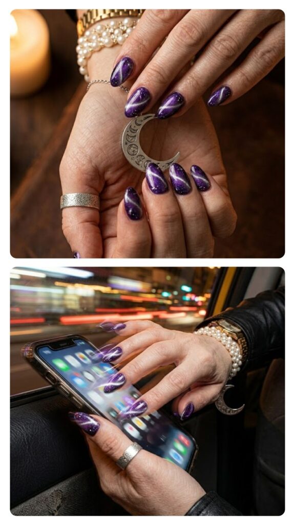 A deep purple base with a shifting silver line creates a cosmic, 3D effect. The magnetic cat-eye technique gives the set so much movement and depth. It’s a moody, cool-toned look that’s great for a night out with the girls.