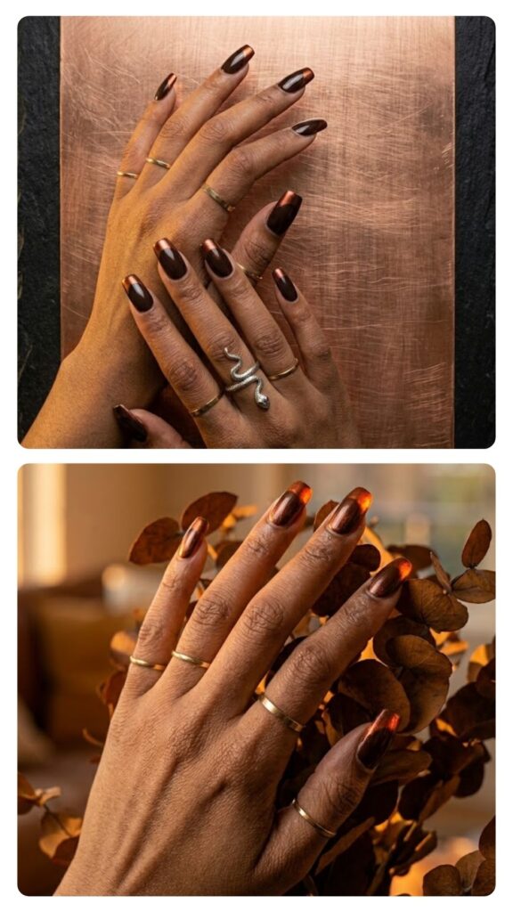 A chocolate brown base with copper duo-chrome tips creates a rich, tonal look. The way the tips change color in the sun makes this set feel super high-end. It’s a moody take on the classic French mani that feels very 2026.