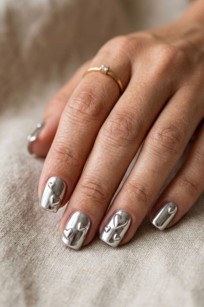Liquid silver chrome looks incredible on a short, square-shaped overlay. Your nail tech can hand-paint tiny 3D chrome hearts or stars for a Y2K FunHaus aesthetic. Such a fun way to add personality to a shorter set without feeling too bulky or over-the-top.