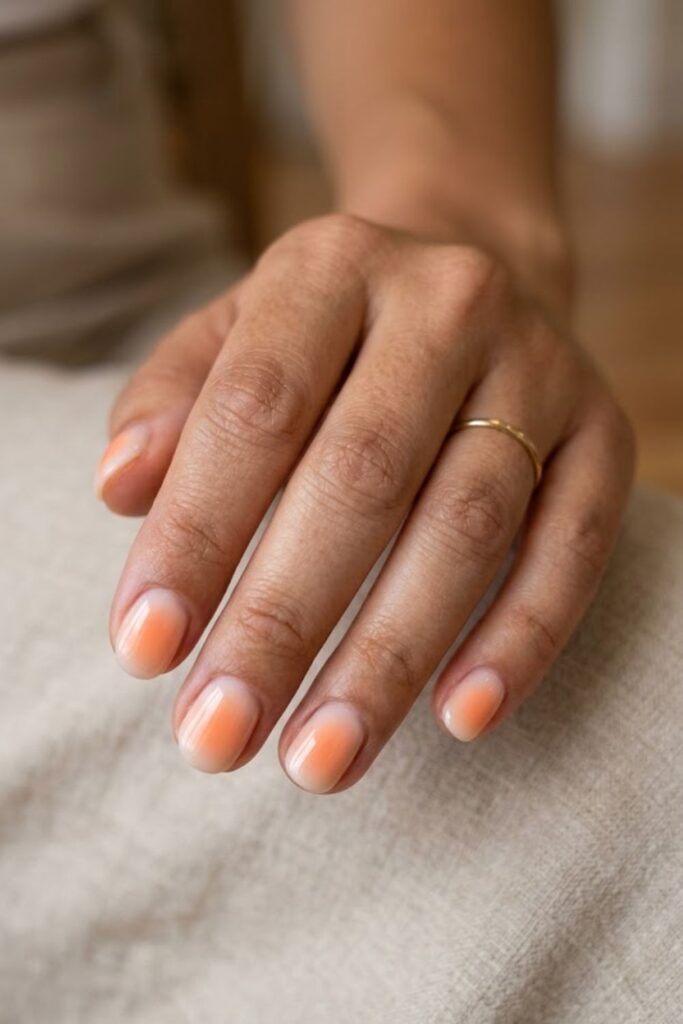 Airbrush aura centers in a warm peach tone give your nails a soft, glowing energy. This technique creates a blurry gradient that looks amazing on a short almond or round shape. For the girl who loves a trendy, sunset-inspired mani that feels totally modern.